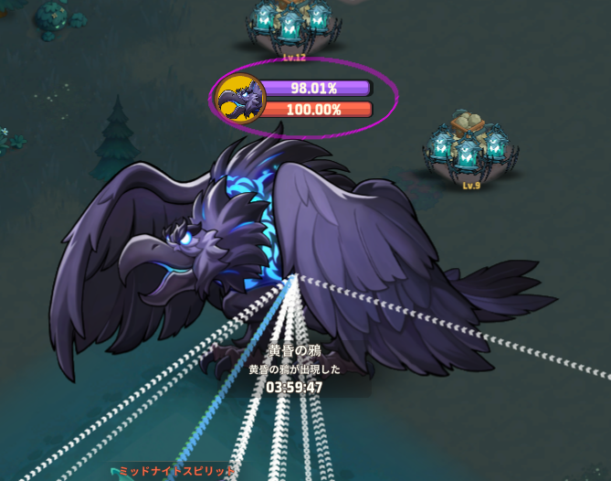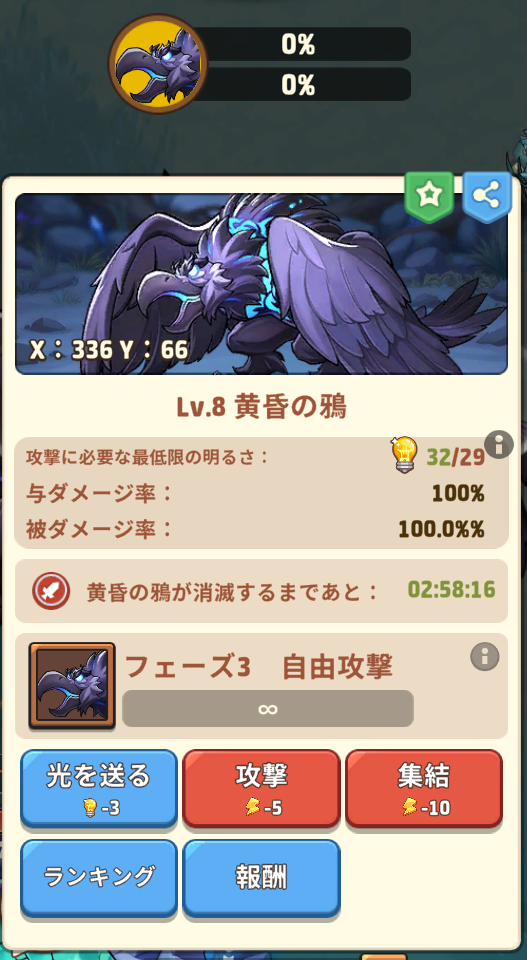 出現するタイミングで上段ゲージが0%になる時間は様々ですが、とにかくこの光を送るクエストを完結したい場合には鴉のです時間を把握して、出現と共に【光を送る】ボタンを押しましょう。